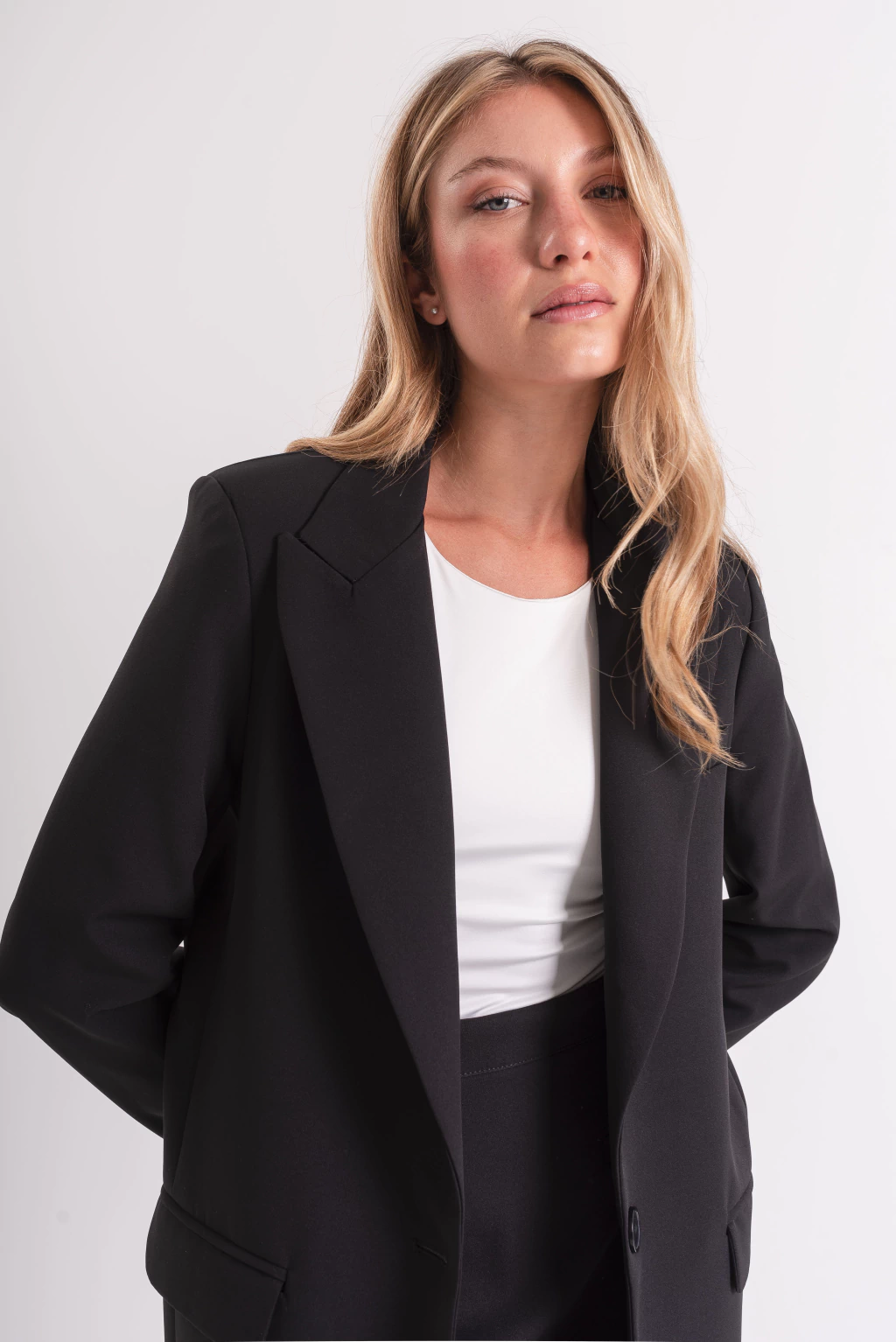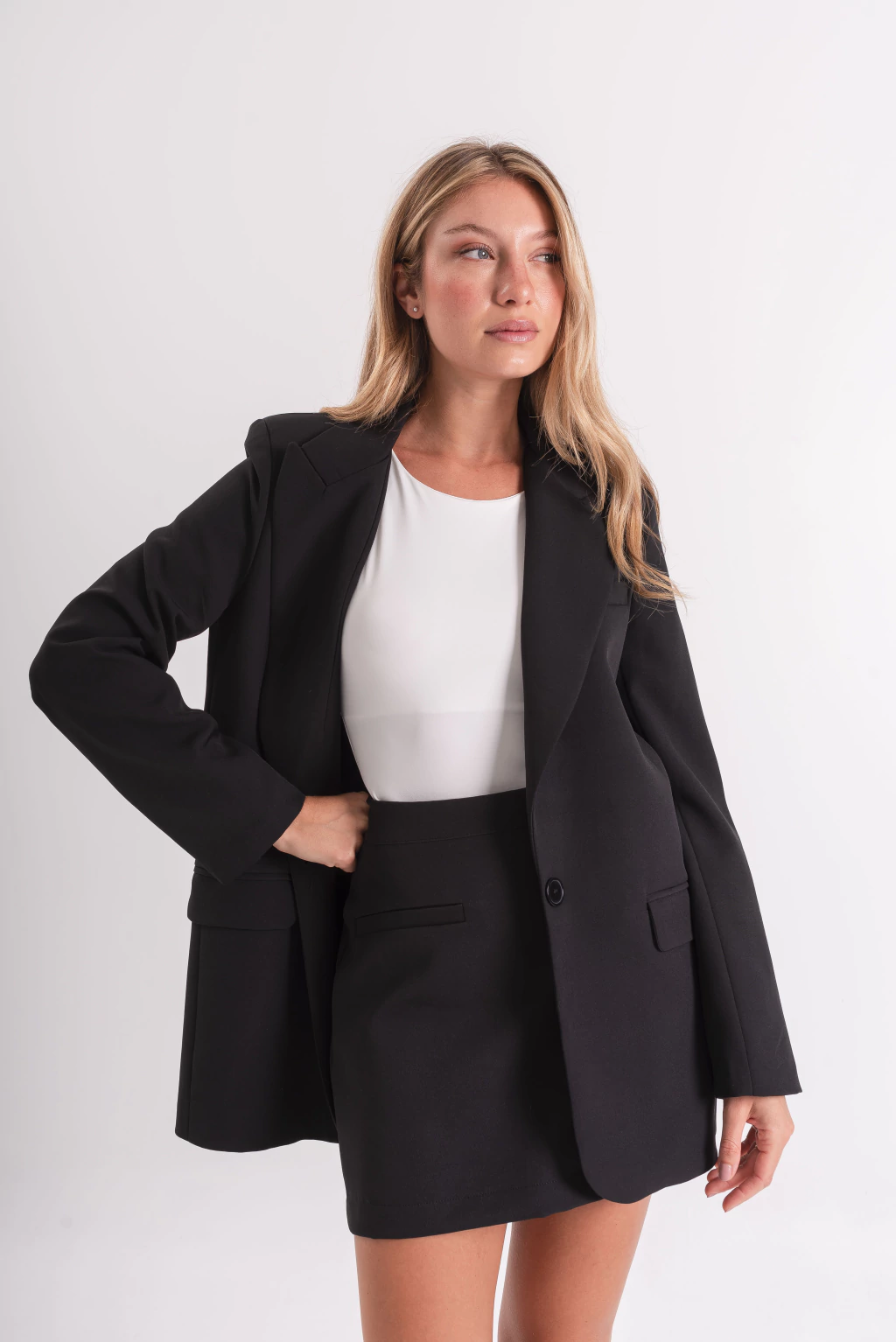 Blazer sastrero de cruce a un botón. La calidad de la tela es premium, suave y sofisticada al tacto. Posee bolsillos en delatero y está completamente forrado en su interior.