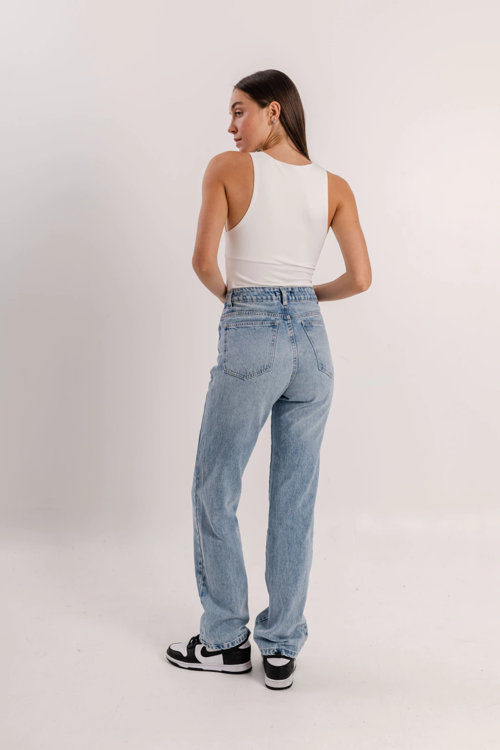 Jean confeccionado en denim azul. Es una prenda versatil, es un básico infaltable en tu guardarropas. La modelo está usando talle 36.