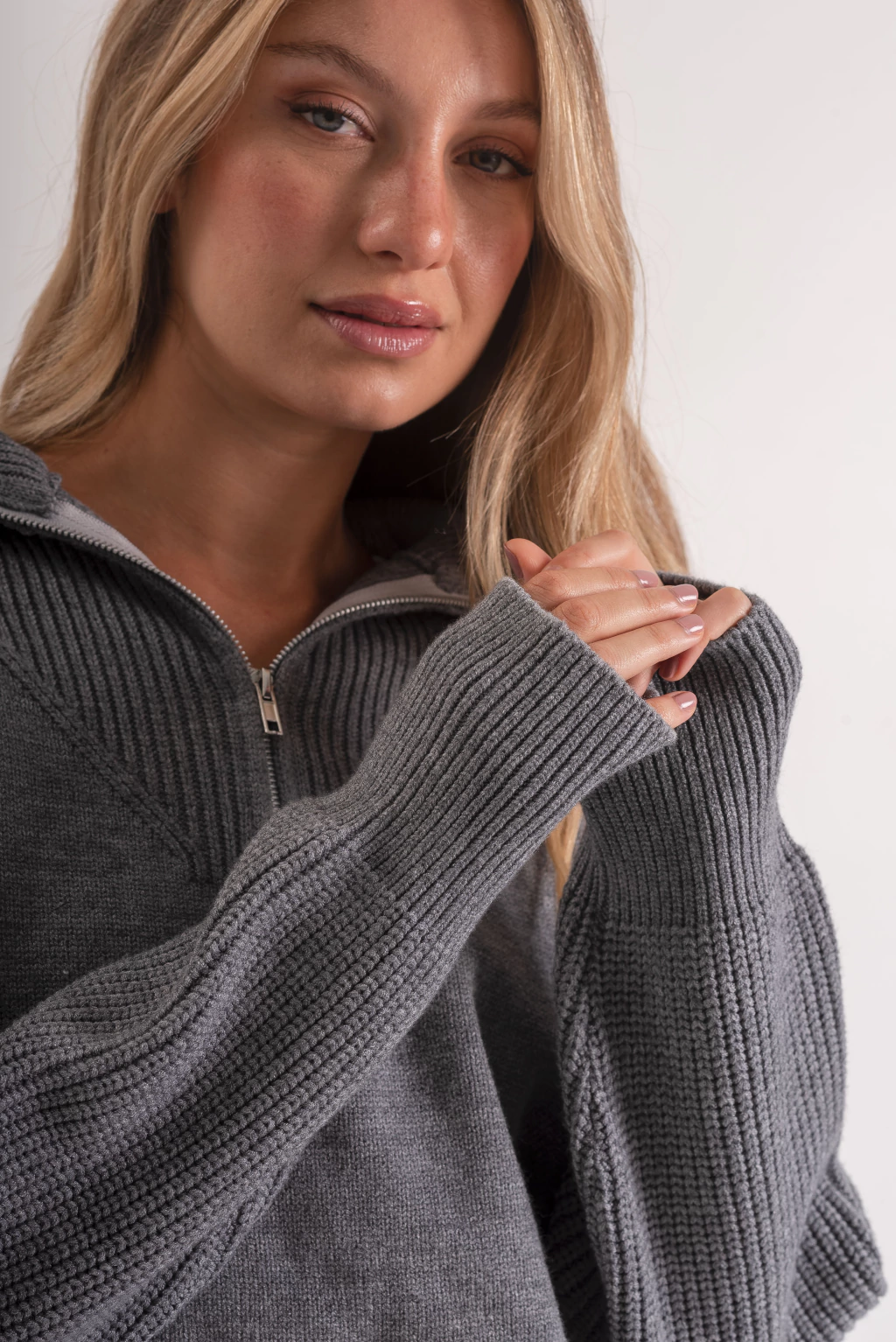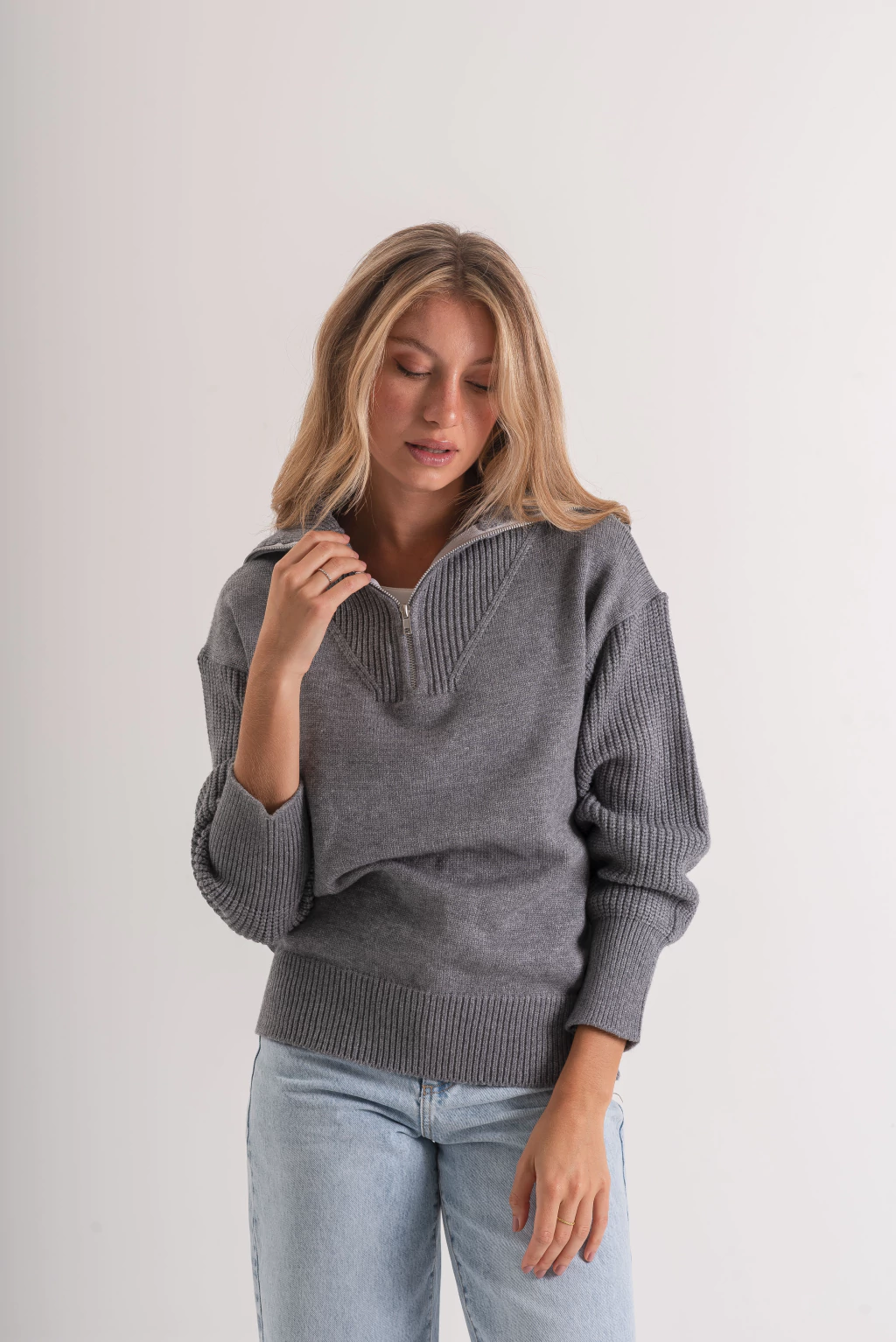 Sweater gris con cierre en el centro. Posee cuello pronunciado. Su tejido es de calidad premium, suave y muy abrigado. Es un básico con diseño que eleva cualquier outfit.